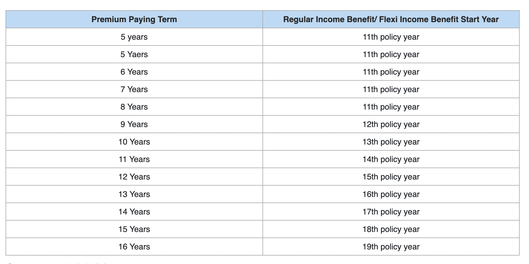 Upon the survival of the Life Assured, a Regular Income Benefit equivalent to 10% of the Basic Sum Assured will be disbursed after each policy year. This commences from the specified year in Table 1 below, contingent upon the payment of all due premiums.